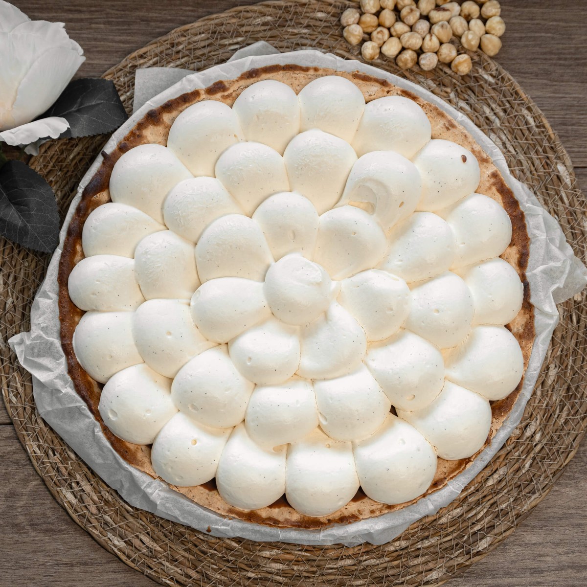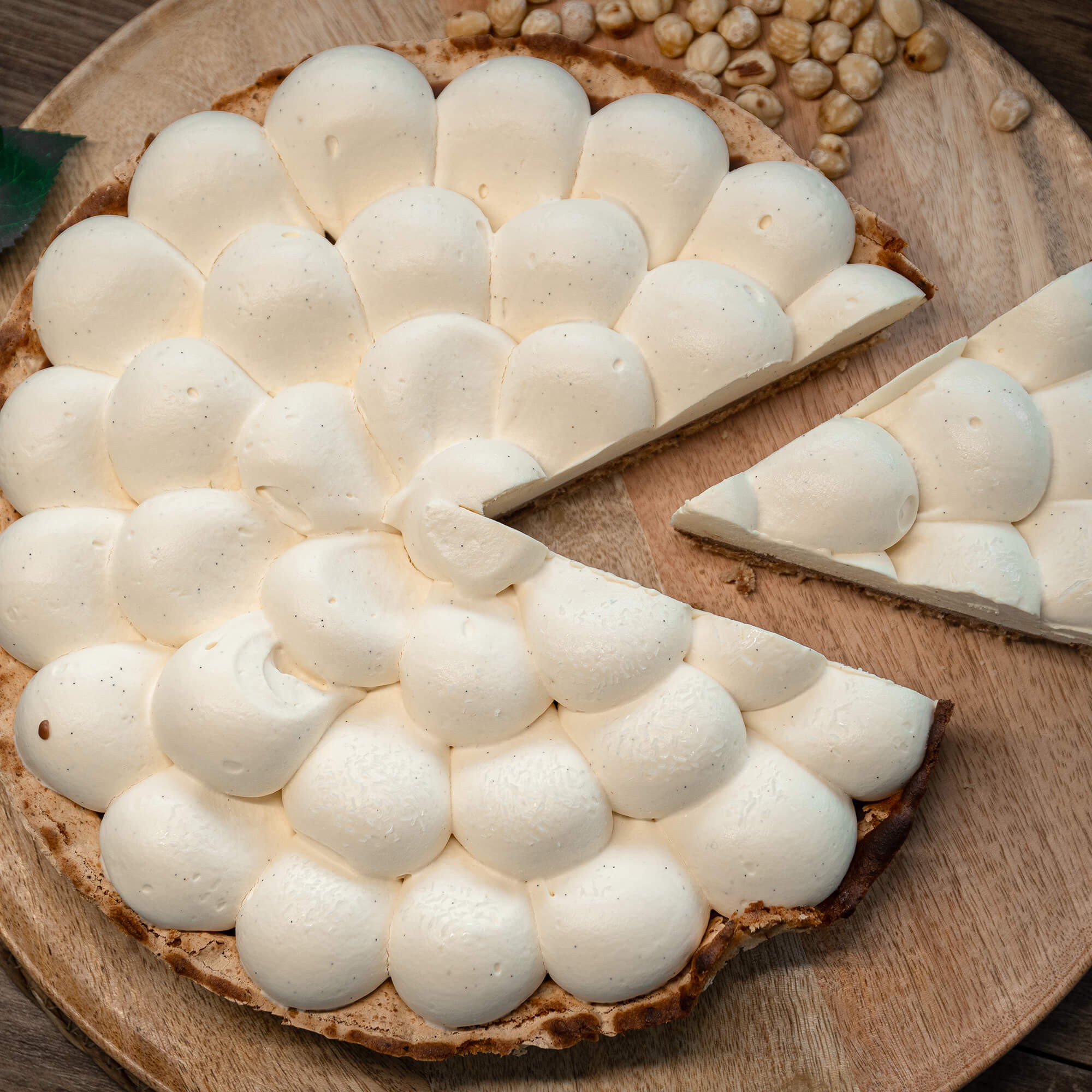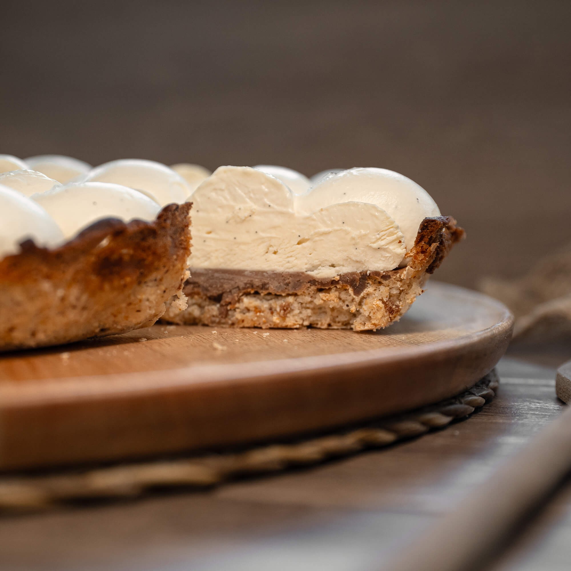 Une crème brûlée au gianduja et chocolat au lait, posée sur un macaron à la noisette, le tout surmonté d'une mousse à la vanille.