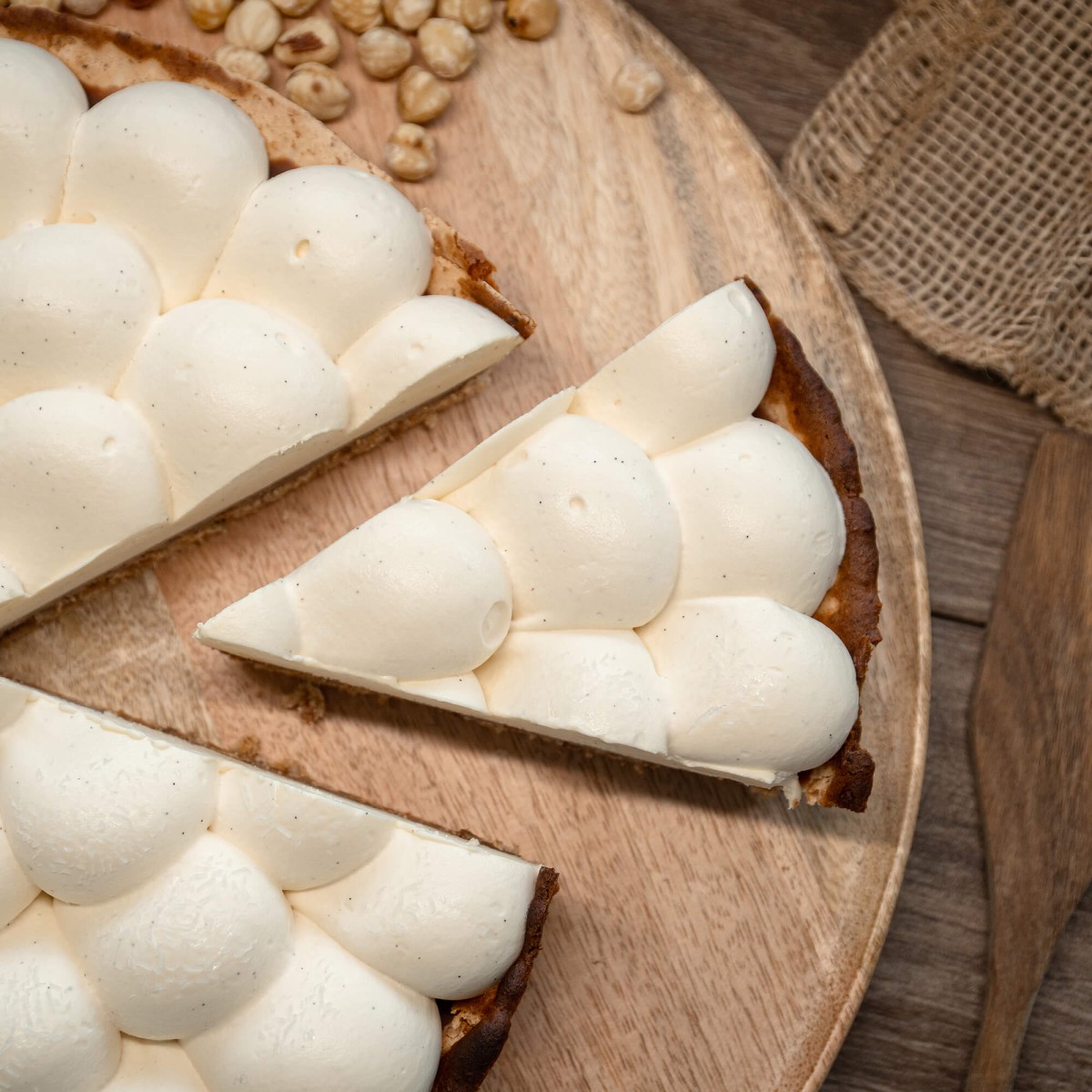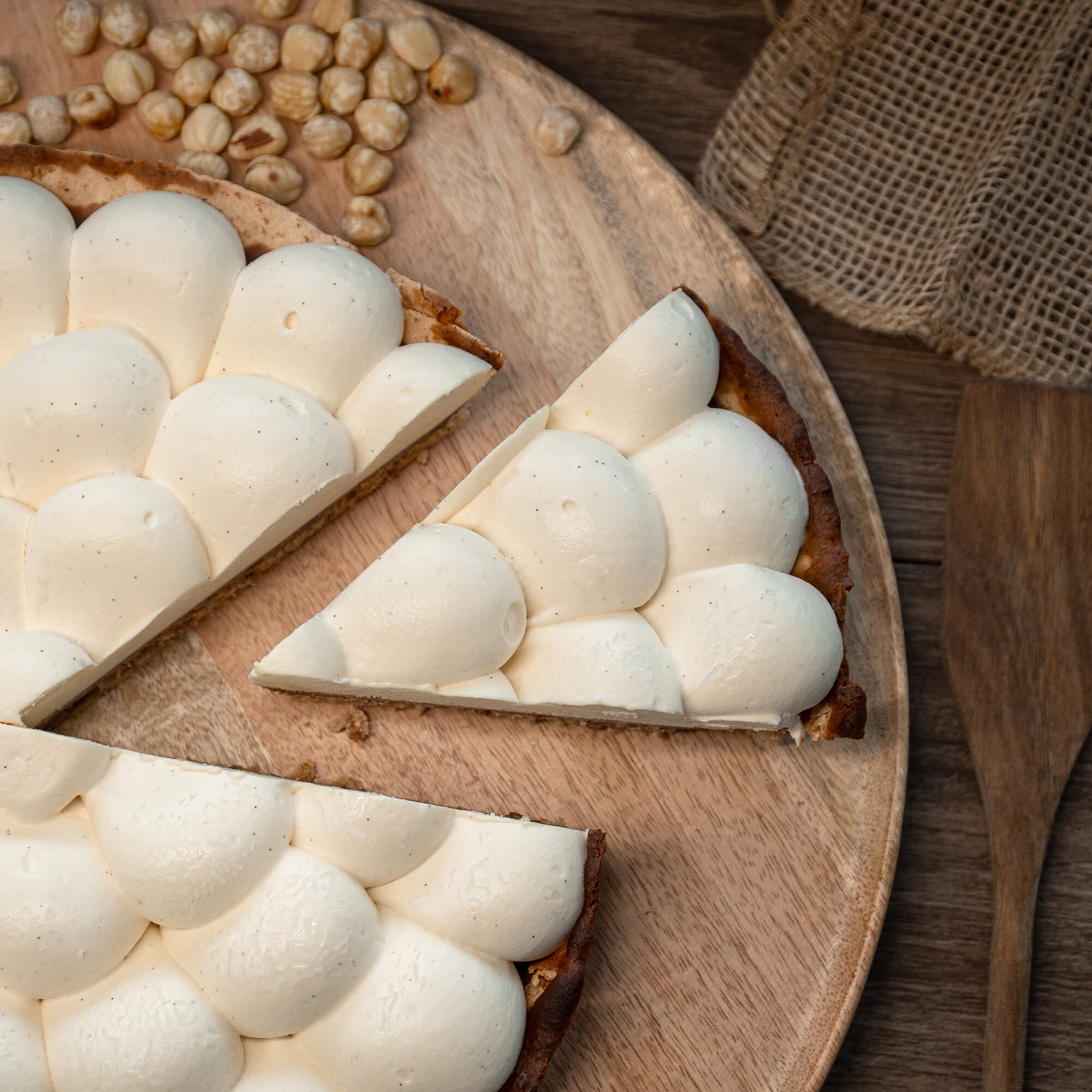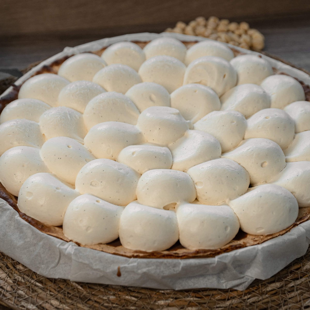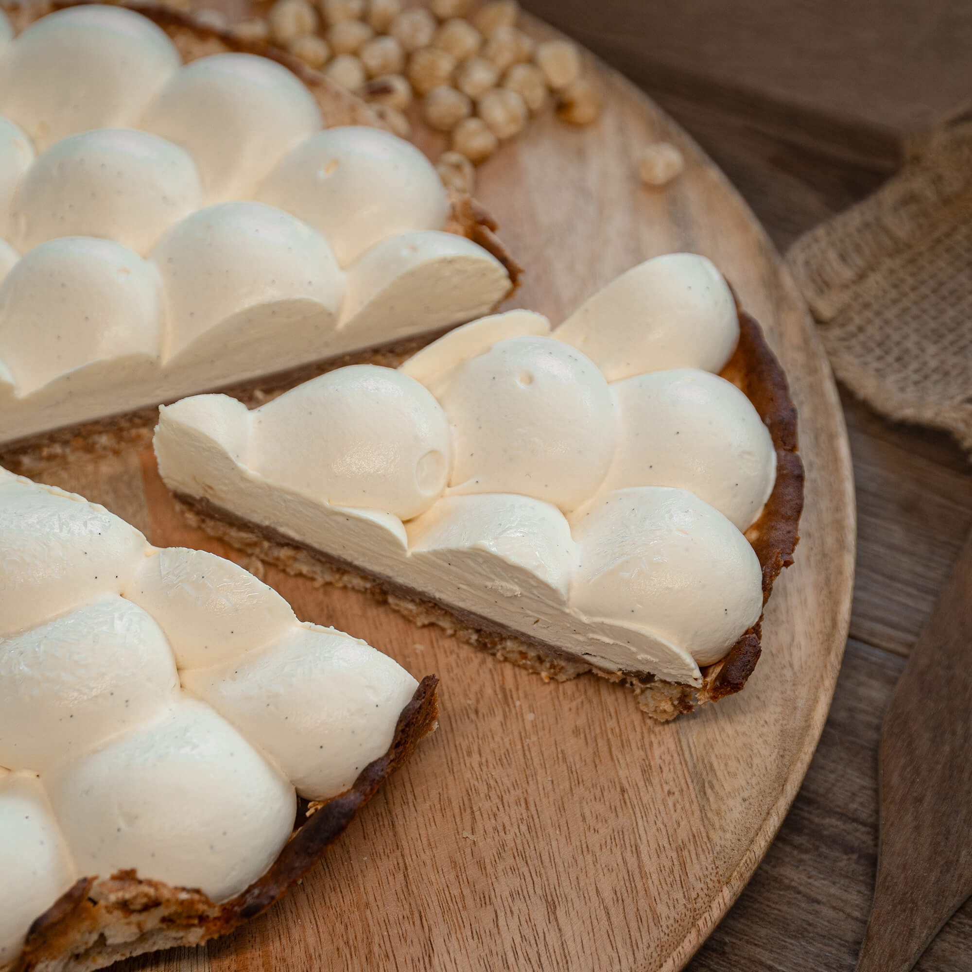 Une crème brûlée au gianduja et chocolat au lait, posée sur un macaron à la noisette, le tout surmonté d'une mousse à la vanille.